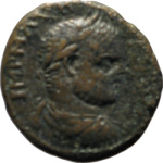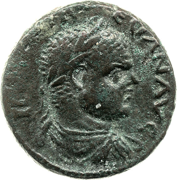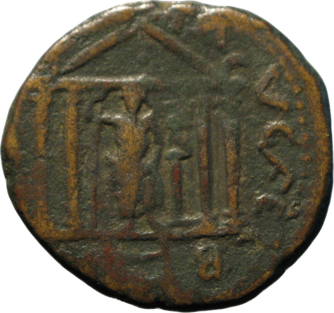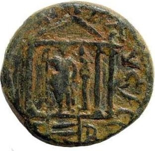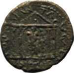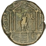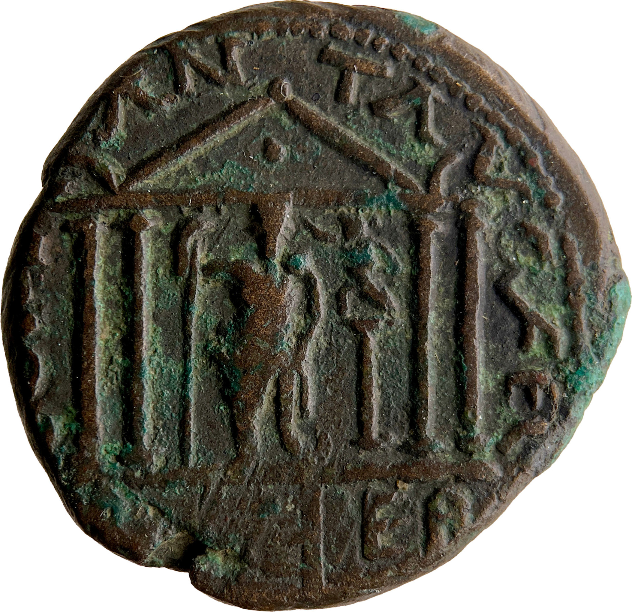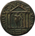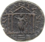 temple with four columns with steps leading up to it, pellet in pediment, with cult statue of Astarte turreted, standing facing within, holding aphlaston in her right hand, her left foot standing on prow; to right, column surmounted by Nike, crowning Astarte |