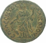 Tyche standing facing head left holding rudder in right and cornucopia in left