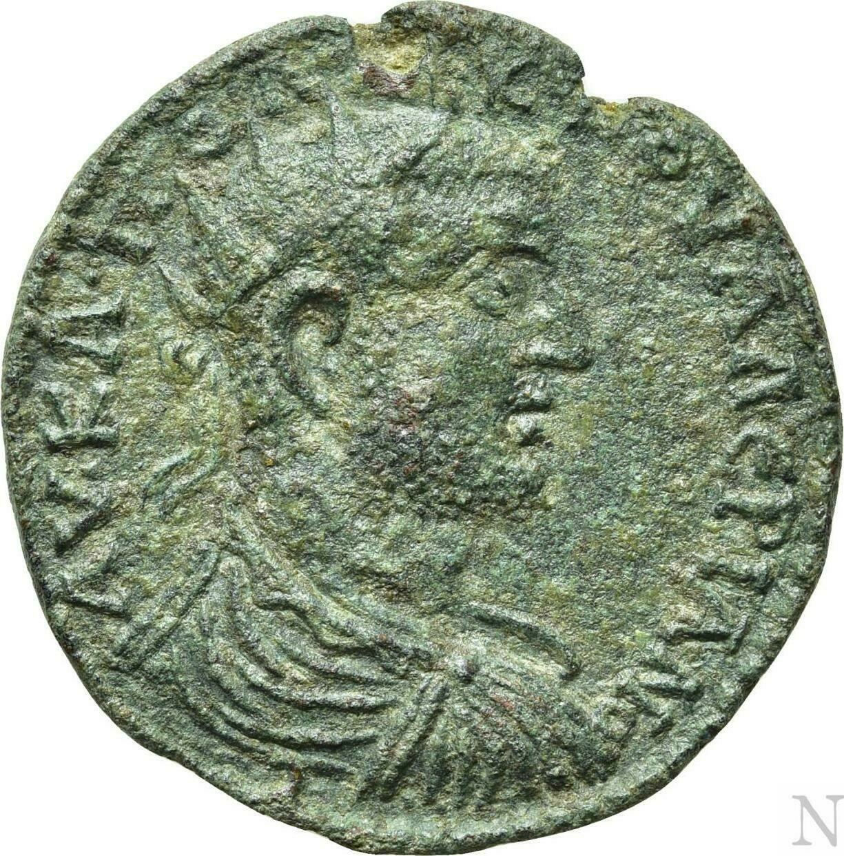 Leto advancing right, head left, drapery billowing behind, holding child in each arm, looking back at inscribed agonistic crown |