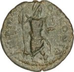 Mên standing facing, head right, holding sceptre and Nike; foot on bucranium; to left, cock