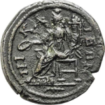 Homonoia seated left, holding patera and cornucopia; below, fish (?)