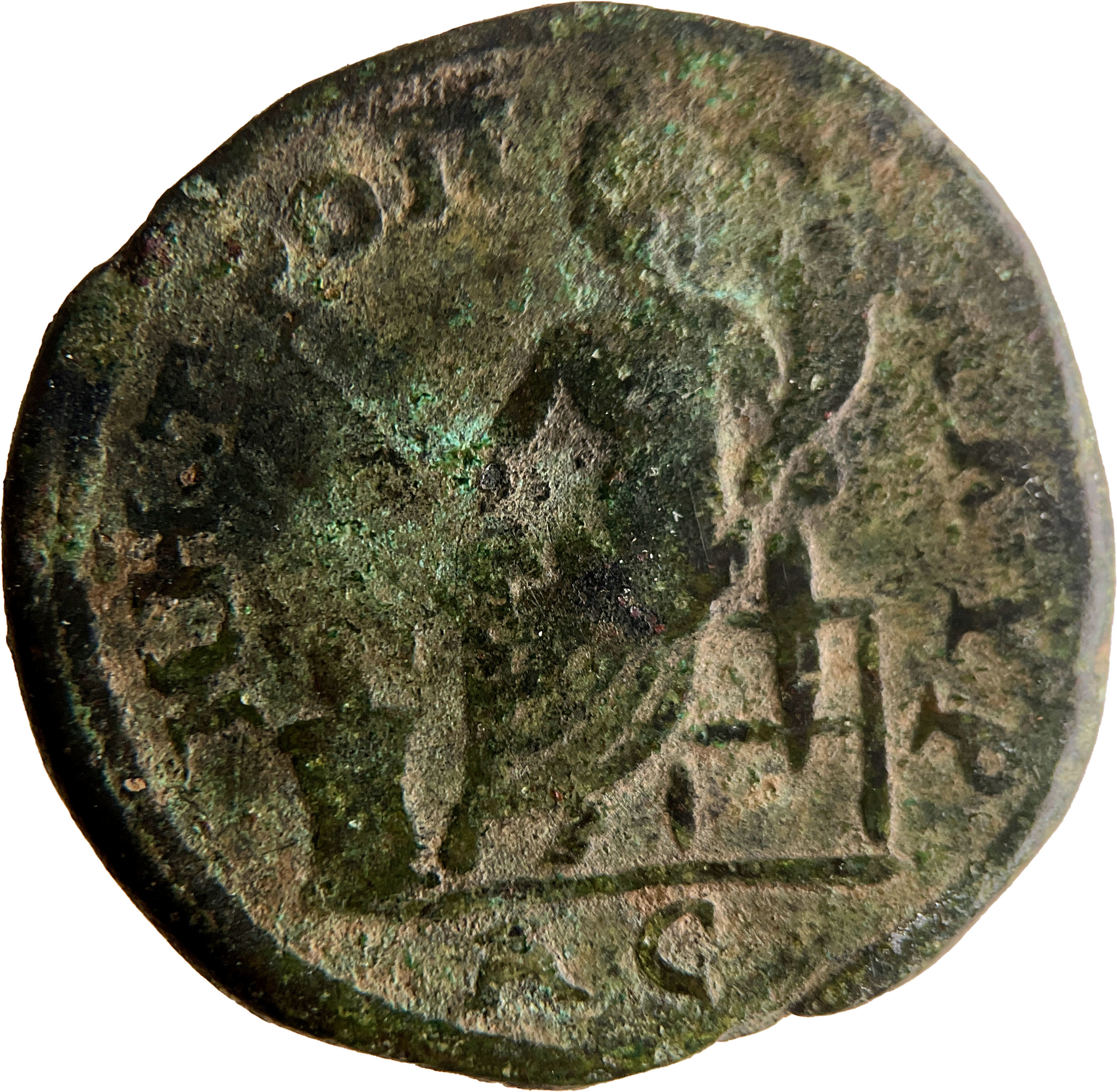 Tyche seated left, holding patera and cornucopia; to left, altar