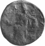 Cybele seated left on throne, holding patera in her extended right hand, left arm resting on tympanum; in front and below, lion left