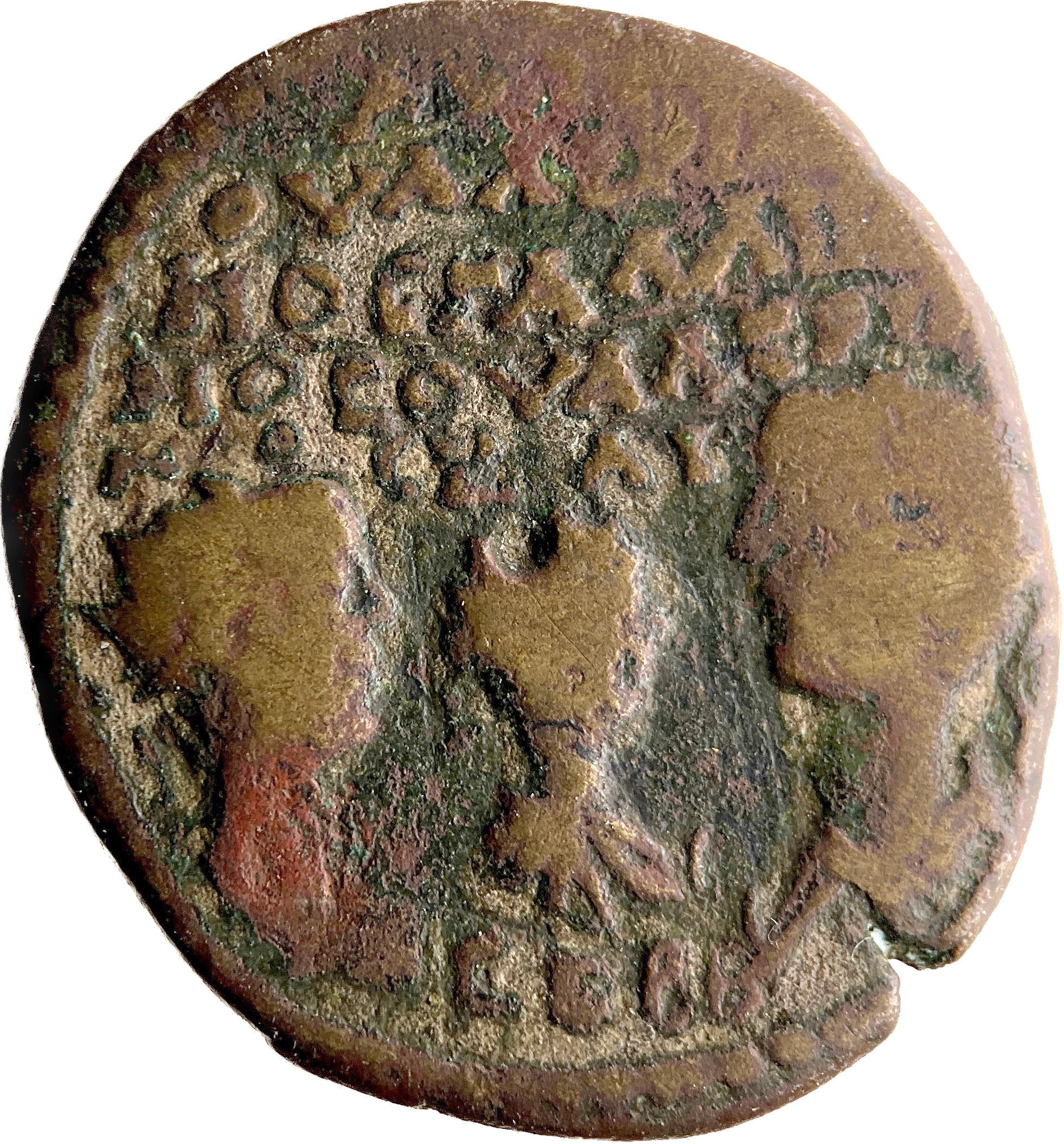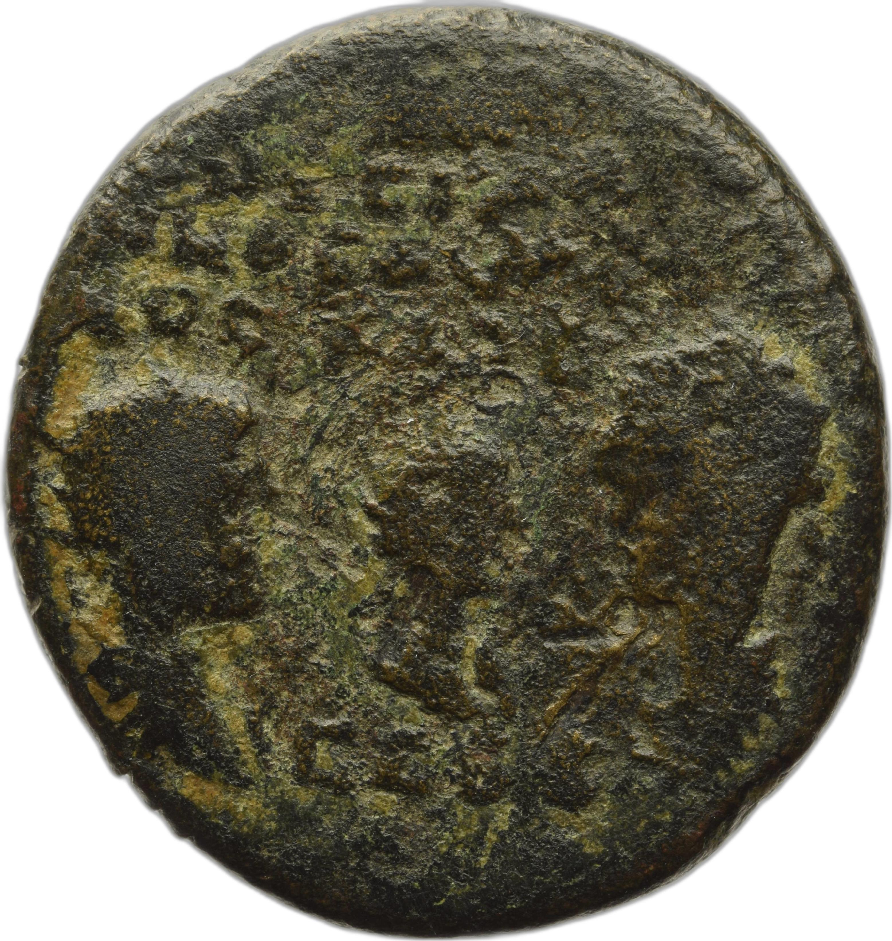 confronted radiate, draped and cuirassed busts of Valerian and Gallienus; between, radiate, draped and cuirassed bust of Saloninus (?), right |