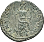 Mên standing facing, head right, holding sceptre and Nike; foot on bucranium; to left, cock