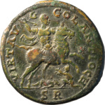 Emperor on horseback, galloping right, brandishing spear; below, two enemies |