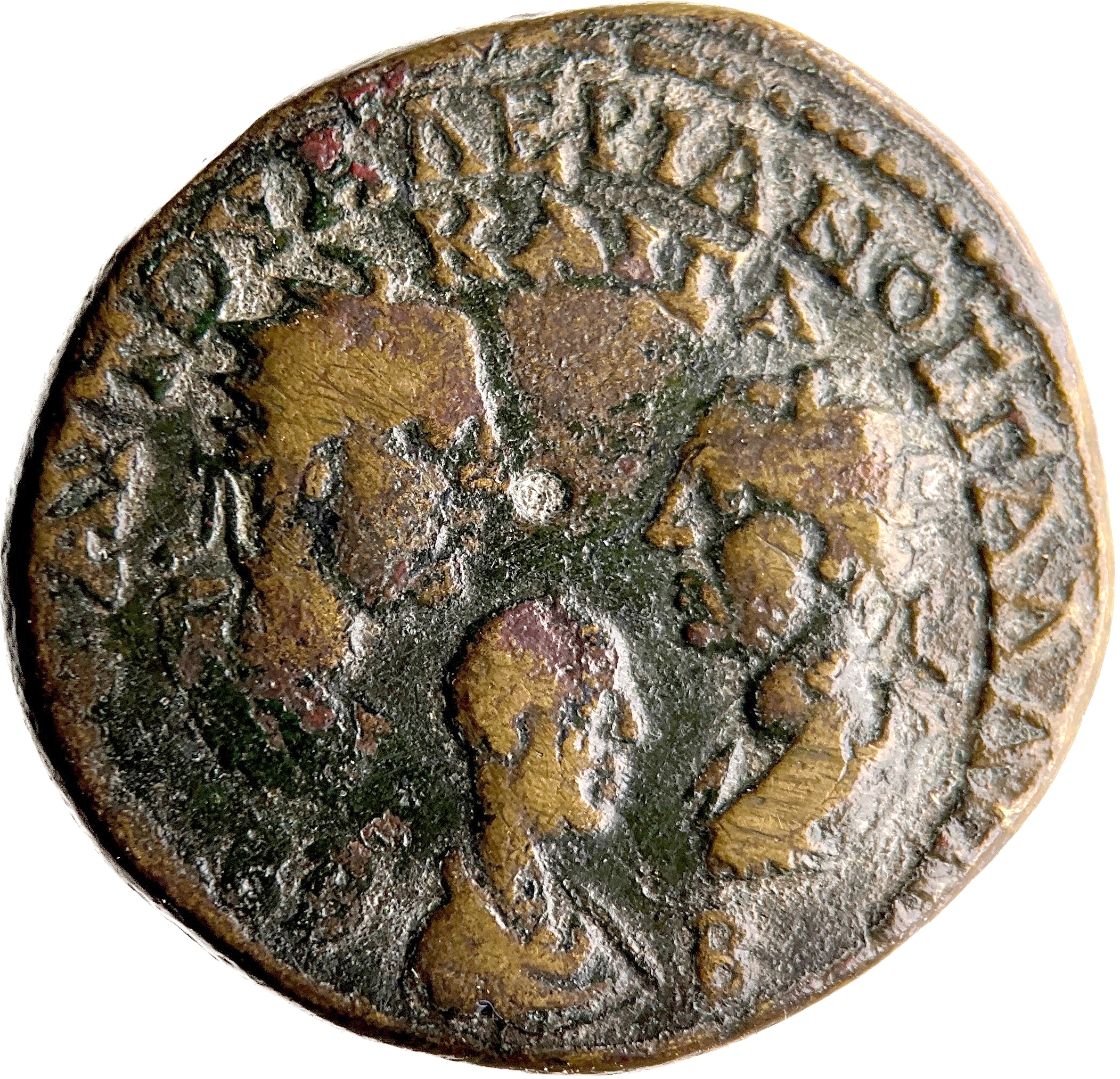 confronted radiate, draped and cuirassed busts of Valerian and Gallienus; between, bare-headed, draped and cuirassed bust of Valerian II, right |
