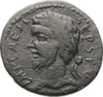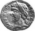 Mên standing facing, head right, holding sceptre and Nike; foot on bucranium; to left, cock