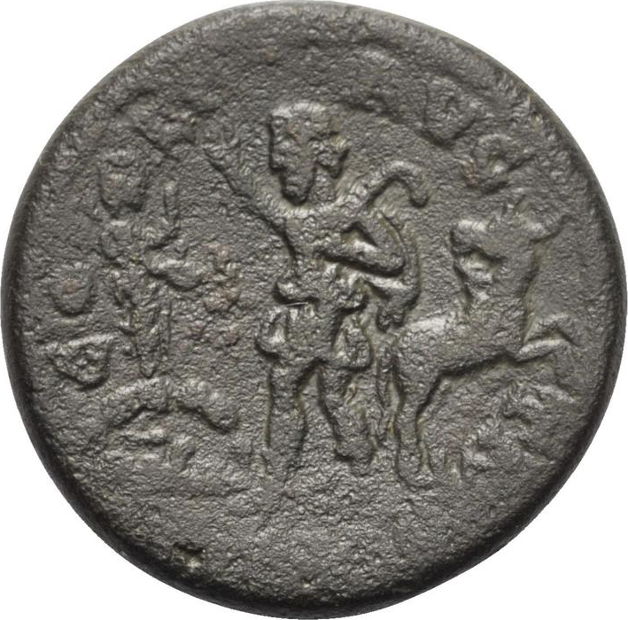 in centre; herdsman (Ordes) advancing left, raising arm, carrying pedum; to left, cult statue of Apollo Smintheus standing on the top of a cave housing a sacred spring, right, with quiver on shoulder, holding bow and patera; to right, bull(?) jumping, right, head, left |