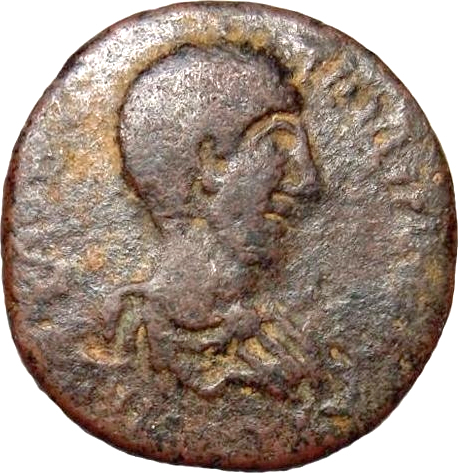 bare-headed, draped and cuirassed bust of Philip II, right, seen from rear