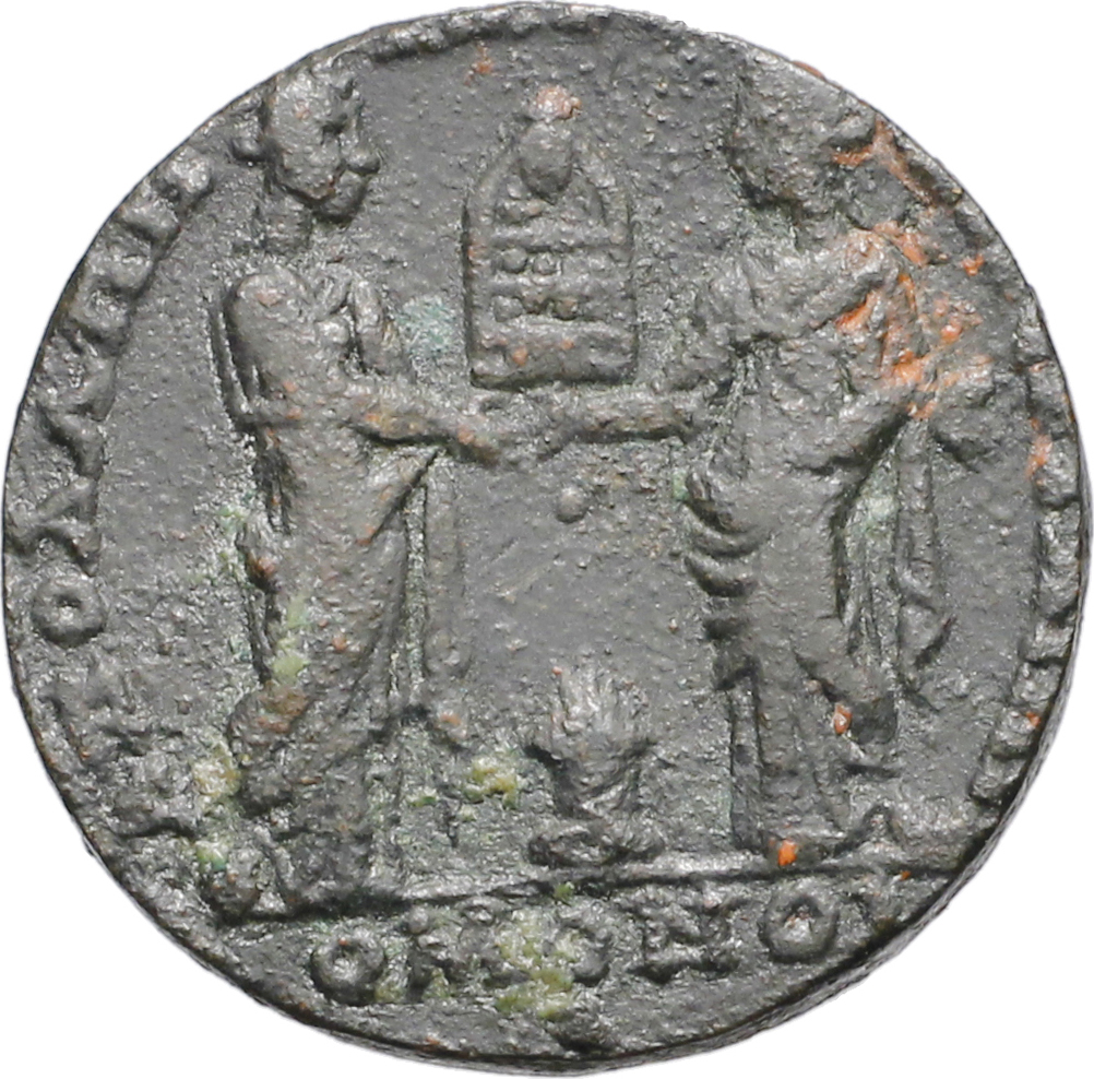 Tyche of Apollonia, standing facing, head right, holding sceptre, clasping hands with Tyche of Perge standing facing, head left, holding sceptre