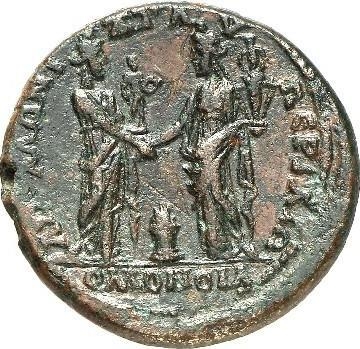 Tyche of Apollonia, standing facing, head right, holding statuette of Apollo, clasping hands with Tyche of Perge standing facing, head left, holding statuette of Artemis Ephesia; between, altar