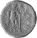 Dionysus standing, right, crossing legs, holding bunch of grapes and cantharus, resting left arm on column