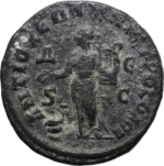 Apollo standing left, holding patera and lyre; at feet left, serpent coiling around omphalos |