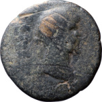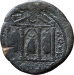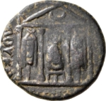 temple with four columns with crescent in pediment; in central intercolumnation, conical baetyl on base surmounted by a crescent; in wings, two signa, each in a shrine with two columns surmounted by a crescent