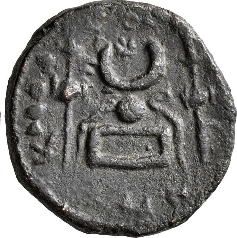 star within crescent set on filleted stone on base; two signa flanking