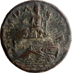 Cybele seated left, holding patera and cornucopia; below, river god reclining left, holding harpoon and resting arm on urn, from which water flows; to left, tree; below, fish