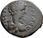 bare-headed, draped and cuirassed bust of Geta, right, seen from rear