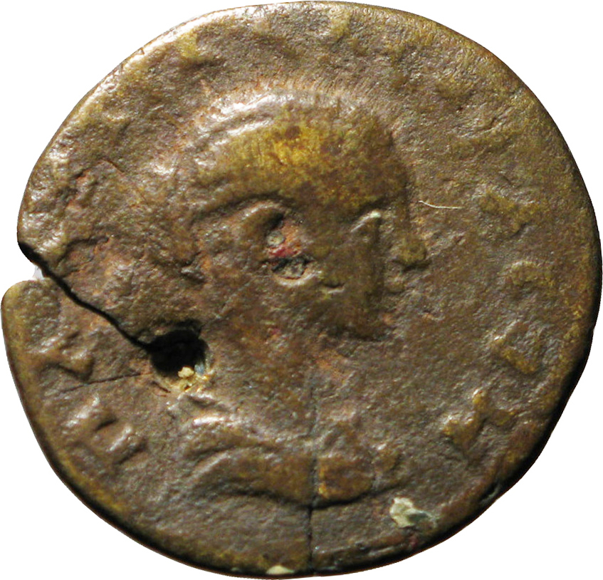 Harpocrates standing nude left, placing hand on his mouth and holding cornucopia