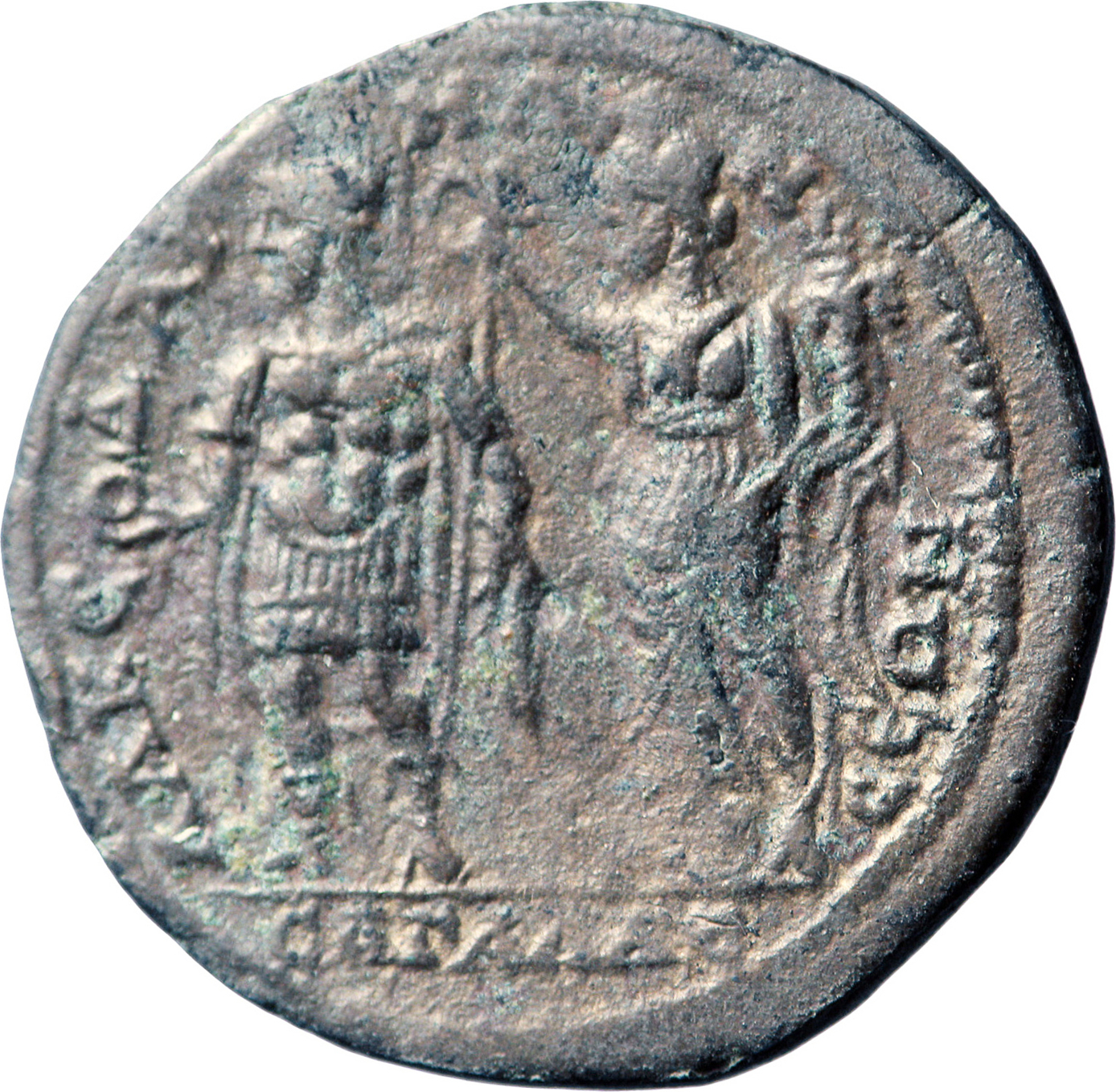 Lacedaemon standing facing, looking right, holding Nike and spear, crowned by Tyche standing left, holding wreath and cornucopia