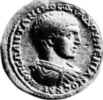 draped bust of Diadumenian (bare-headed), right, seen from rear