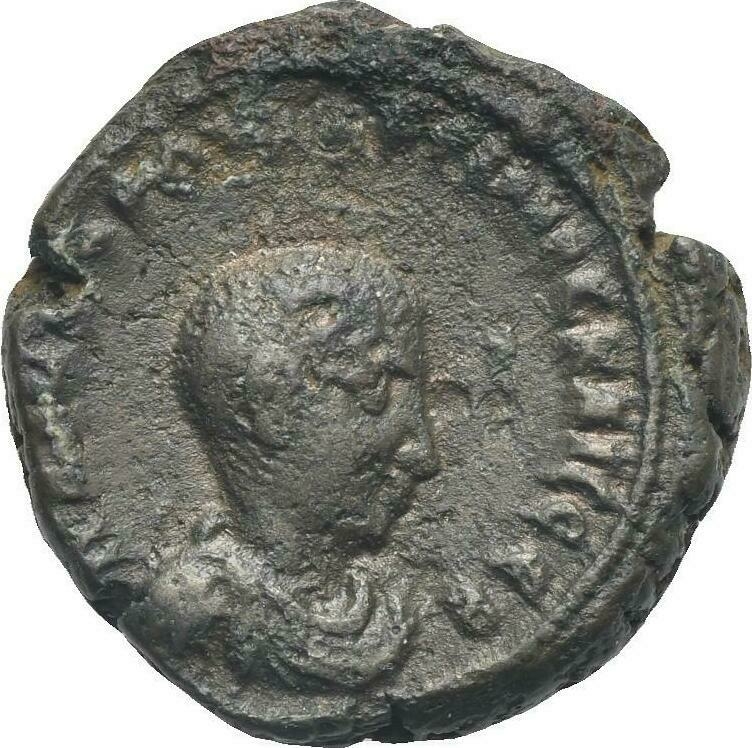 bare-headed, draped and cuirassed bust of Valerian II, right, seen from front |