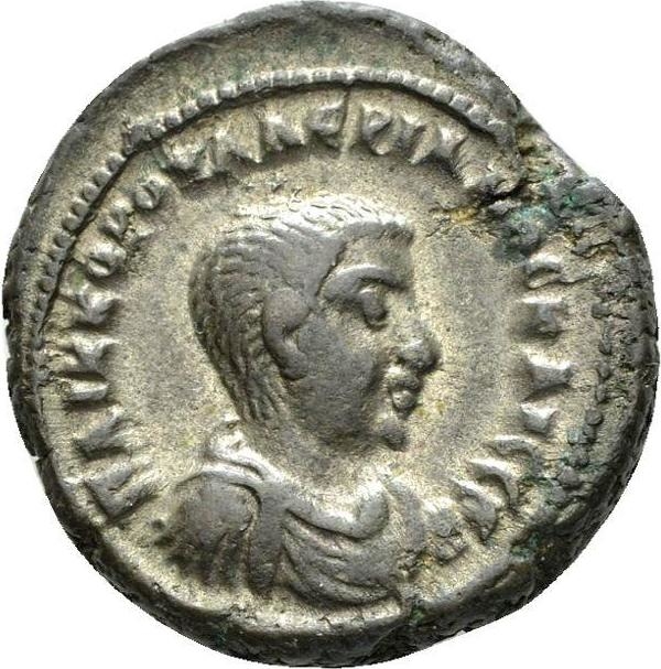 bare-headed, draped and cuirassed bust of Valerian II, right, seen from front |