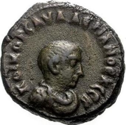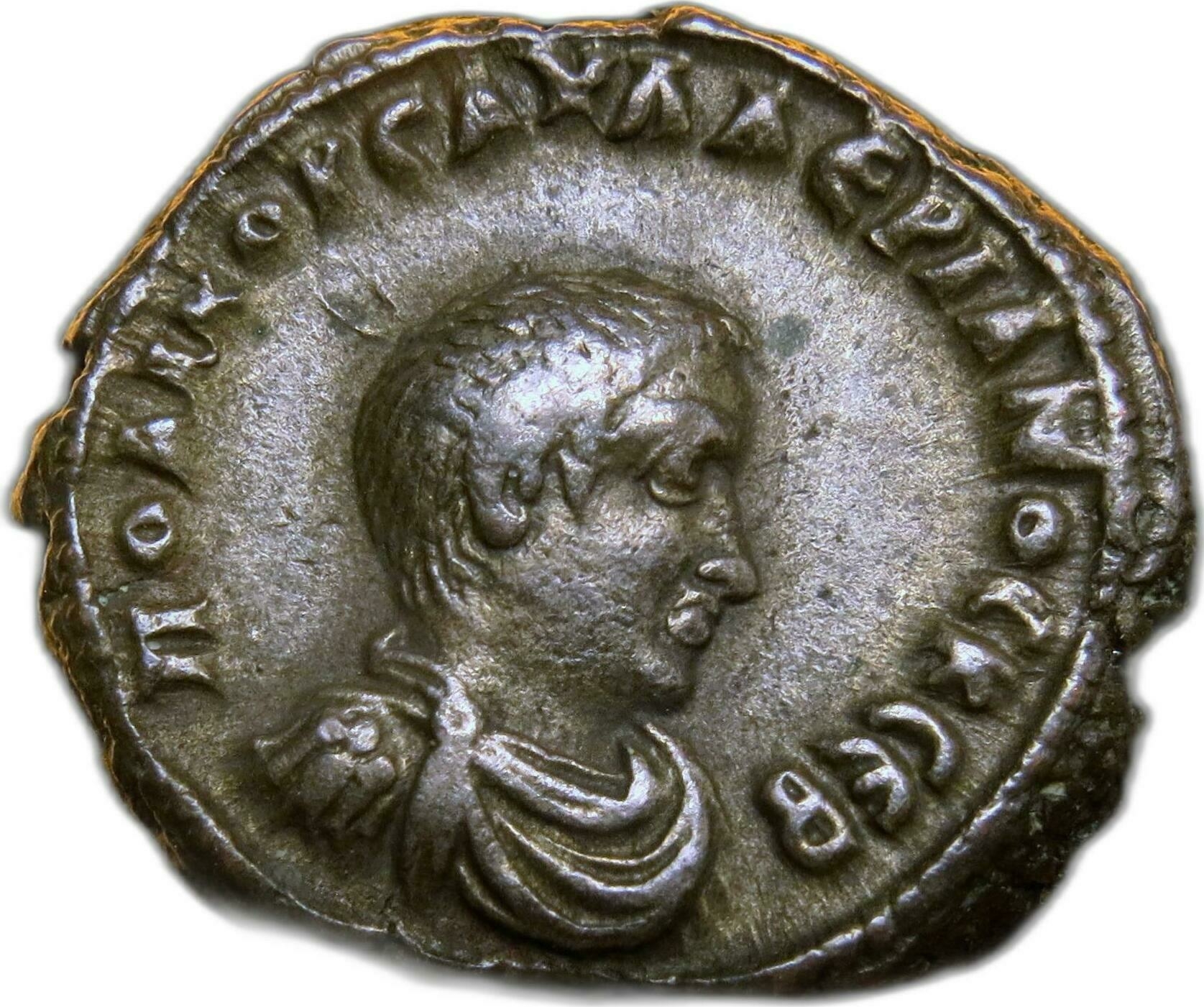 bare-headed, draped and cuirassed bust of Saloninus, right, seen from front |