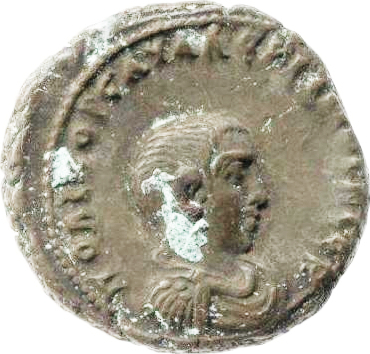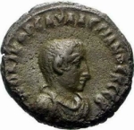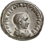 bare-headed, draped and cuirassed bust of Saloninus, right, seen from front |