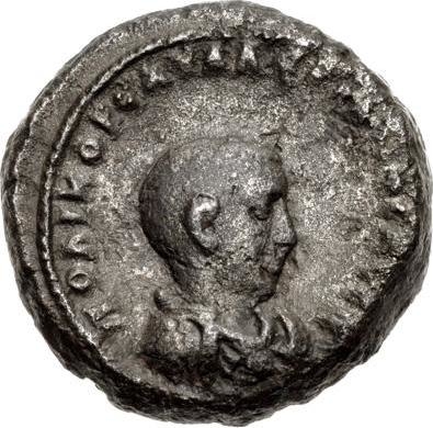 bare-headed, draped and cuirassed bust of Saloninus, right, seen from front |