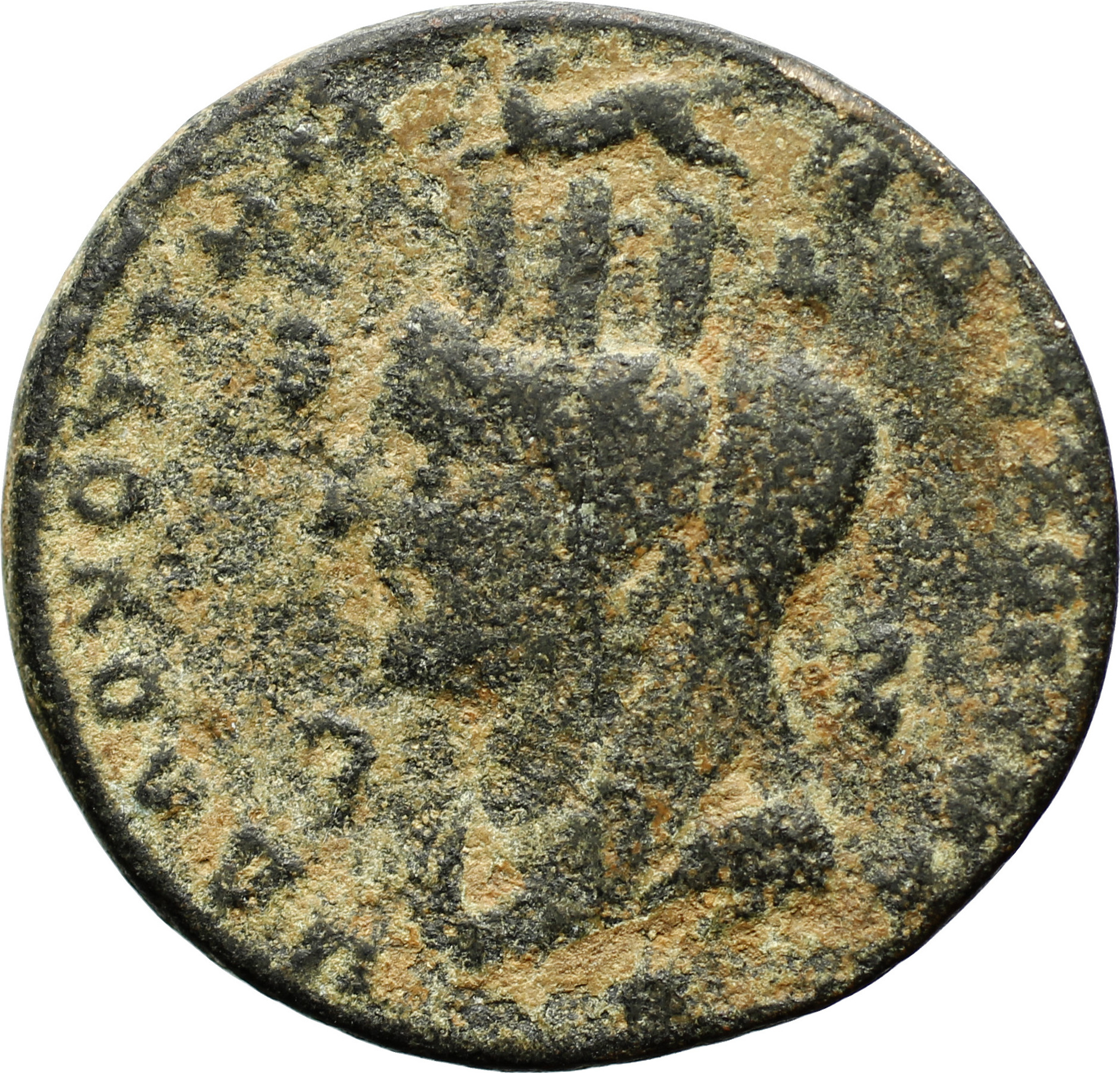 veiled, turreted and draped bust of Tyche, left; above, ram leaping left, head right; below, star, legend and Δ Ɛ and S C retrograde |