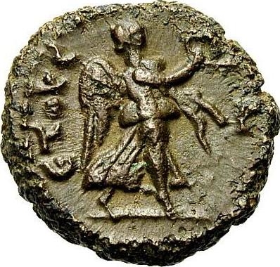 Nike advancing right, holding wreath and palm