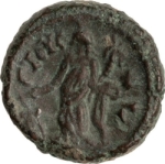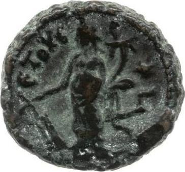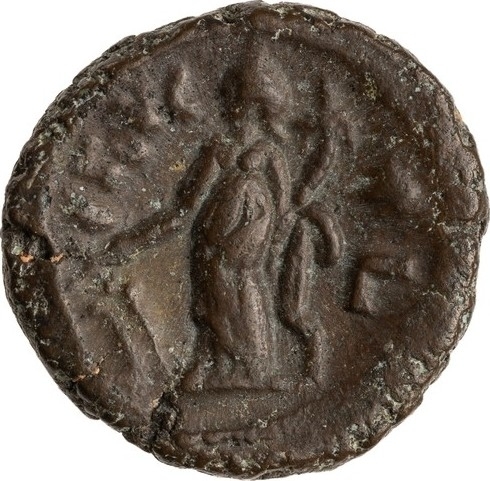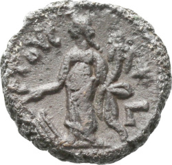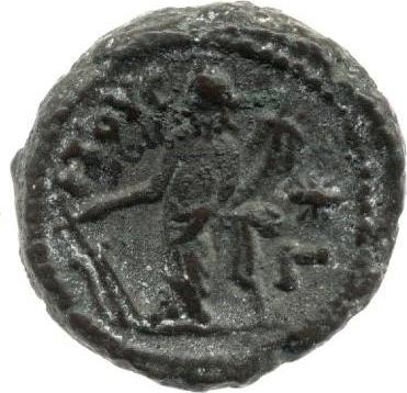 Reverse design Tyche standing left, holding rudder and cornucopia; to left or right, star