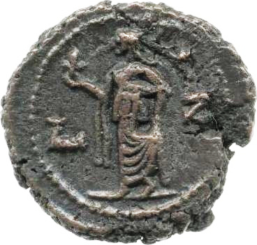 Elpis advancing left, holding flower and raising skirt; to left or right, star