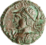 male (bearded?) bust (Constantius or Ares?), helmeted, radiate and cuirassed bust, left, holding trophy over right shoulder and shield on left