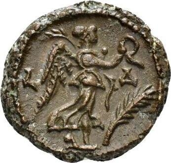 Nike advancing right, holding wreath and palm; to left or right, palm