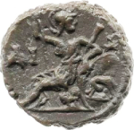 Roma seated left, head right, holding spear and parazonium, leaning on rock; in front of which, she-wolf and twins