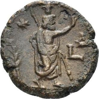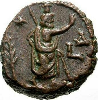 Sarapis standing right, raising right arm and holding transverse sceptre in left; to left, palm and star