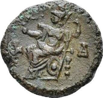 Athena seated left, holding Nike and spear; below, shield