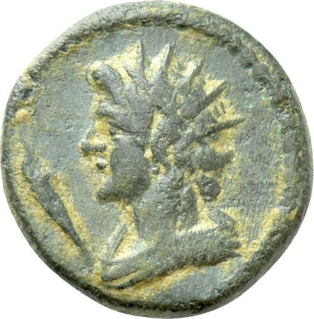 radiate and draped bust of Helios, left