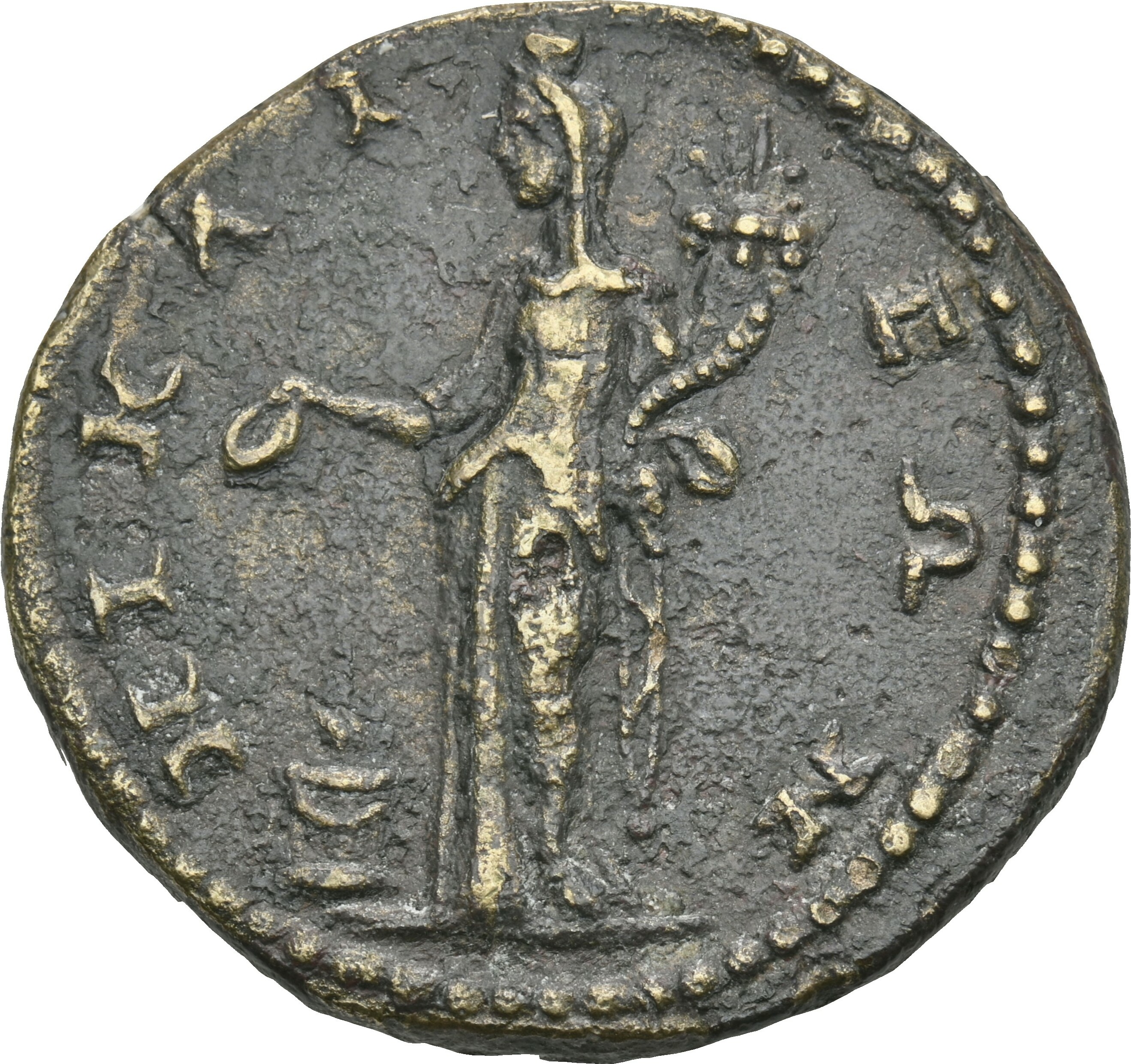 Homonoia standing, left, holding patera and cornucopia; at her feet, left altar