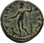 Dionysus standing left, holding thyrsus and sceptre; to left, panther