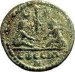 two nude children playing with astragali; between them, in the background, statue of Artemis of Ephesus between crescent and star
