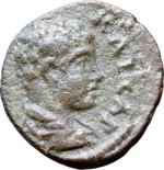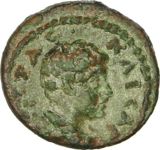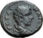 bare-headed, draped and cuirassed bust of Geta, right, seen from rear