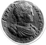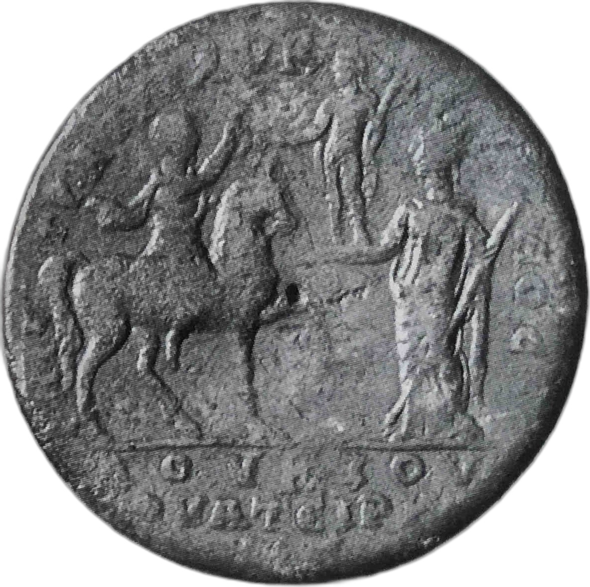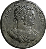 Caracalla in military dress on horseback, right, raising hand towards Tyche of Thyatira standing right, holding statue of Apollo-Tyrimnaios and sceptre |