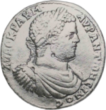 Caracalla in military dress standing left, holding patera over altar and spectre; on the left, Asclepius standing facing, head left, holding serpent staff and, on the right, Tyche of Thyatira standing left, crowning the emperor, and holding sceptre |