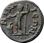 Zeus naked standing facing, head left, holding patera in his right hand, left resting on sceptre; at his feet, eagle