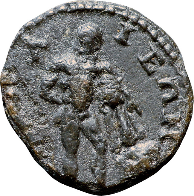 Heracles standing right, holding lion skin