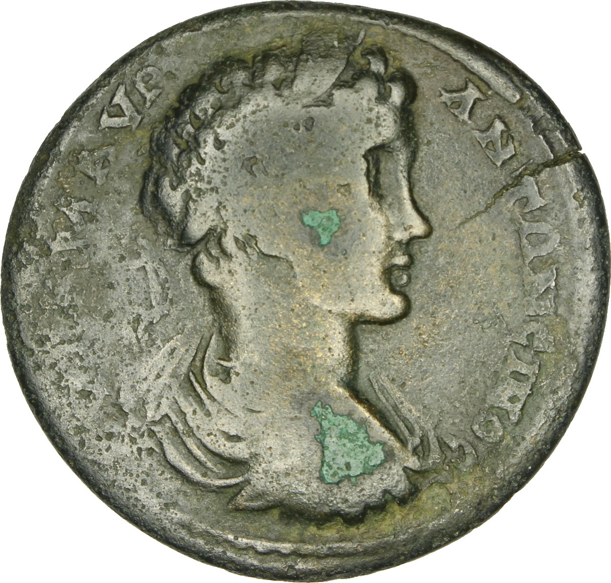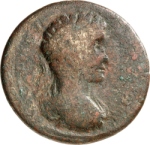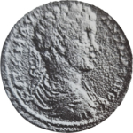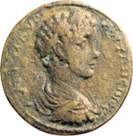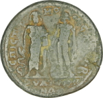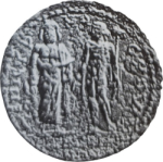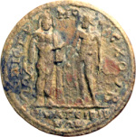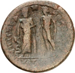 Asclepius standing facing, head right, holding serpent staff, and Apollo-Tyrimnaios standing left, holding branch and double axe |