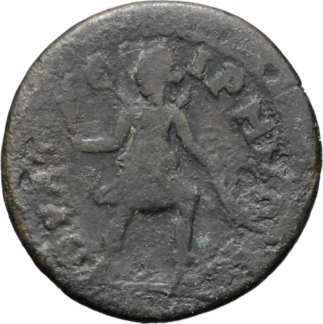 Artemis-Selene-Hecate advancing right, head left, wearing crescent on shoulders and chiton inflated by wind, holding torch in each hand, one upwards the other downwards